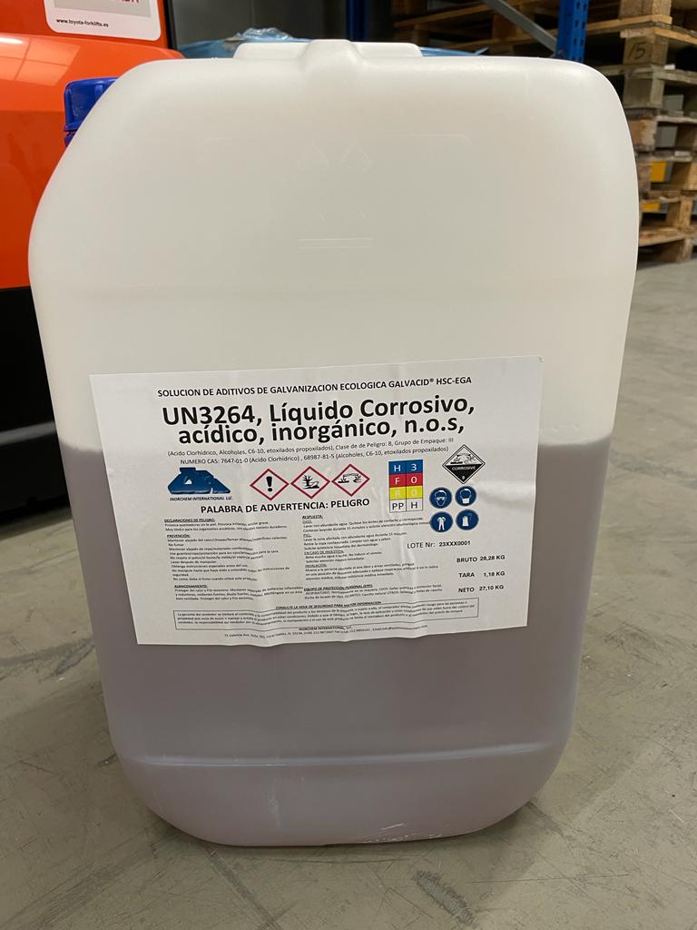The solution of ecological galvanizing additives GALVACID® HSC-EGA is a concentrated solution that is added to Zinc Chloride in 62.5% solution, to obtain the galvanizing Flux (Pre-Flux), for high surface conversion, free of ammonium chlorides, not typical of conventional fluxes, which usually contain between 45% and 55% Ammonium Chloride. These properties contribute to an absolute improvement in the work environment, by totally eliminating toxic ammonia NH3↑ gases derived from the use of these traditional fluxes with high ammonium chloride (NH4Cl) contents, which in turn are precursors for the formation of N2O in the atmosphere, one of the main gases that cause warming on the planet, with a warming potential 298 times greater than CO2 and which also affects the health of personnel and corrodes the structures of buildings and stored raw materials. It is commonly supplied in IBCs in 20 L Jerrycans.